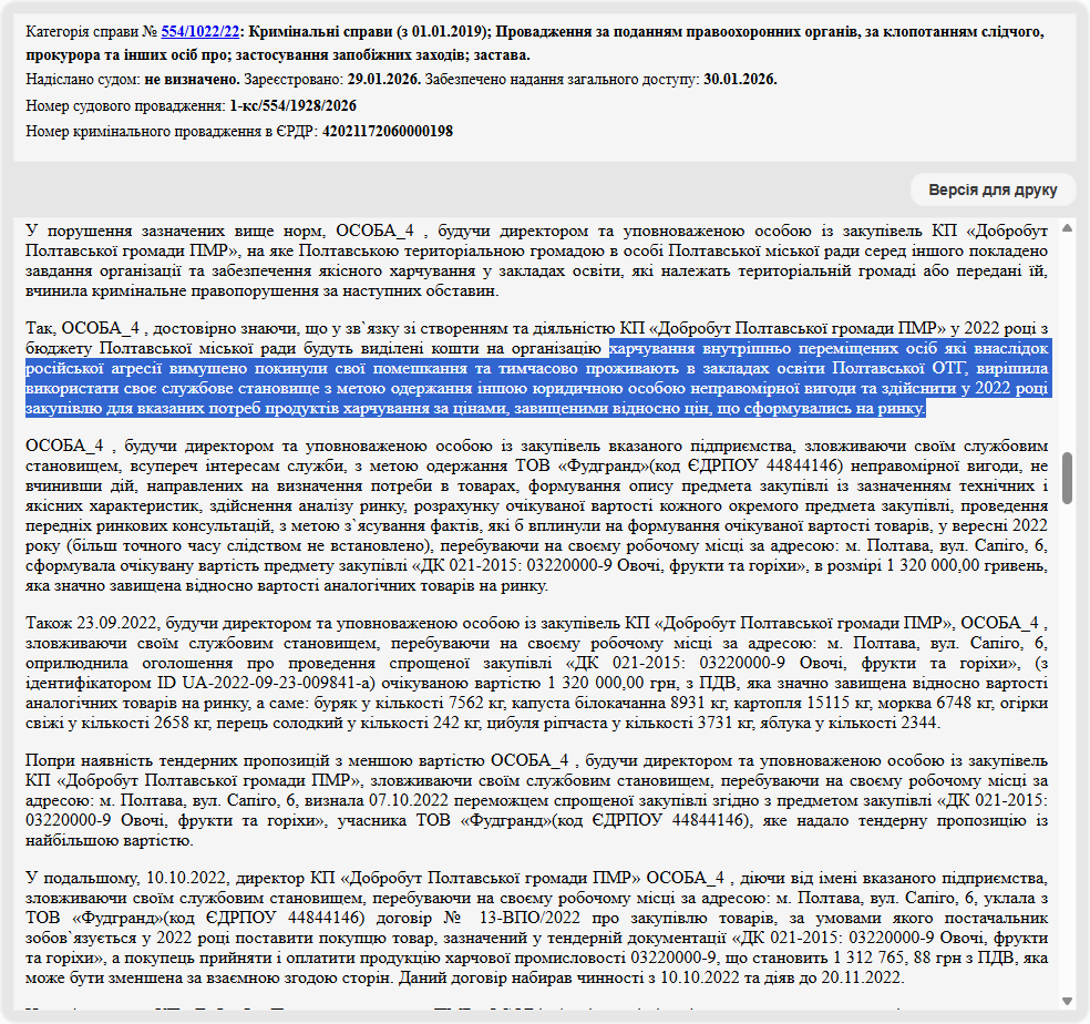 Колишній керівниці комунального підприємства «Добробут» Полтавської міської ради Катерині Гарбар оголосили ще одну підозру в межах антикорупційного розслідування щодо закупівлі продуктів для навчальних закладів Полтавської громади. Перша підозра була оголошена два роки тому й стосувалася кількох закупівель у 2021 році. Нова підозра стосується придбання харчів за завищеною вартістю у 2022 році в інтересах ТОВ «Фудгранд». Експосадовиці підозру оголосили 27 січня.