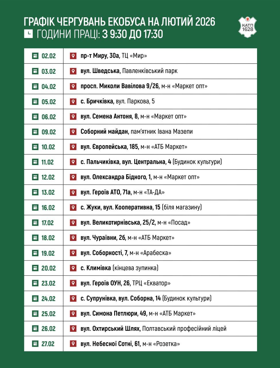 Графік зупинок екобуса на лютий 2026 року в Полтавській громаді (перелік адрес)