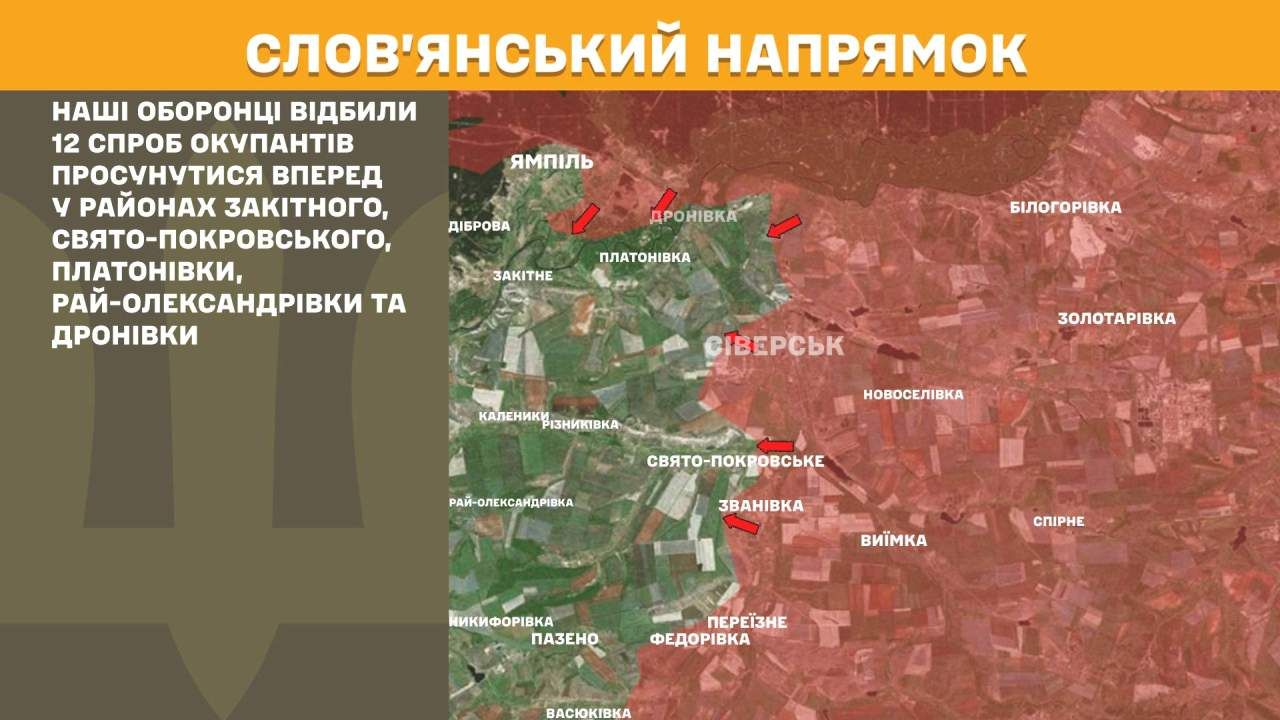 На Слов’янському напрямку наші оборонці відбили 12 спроб окупантів просунутися вперед у районах Закітного, Свято-Покровського, Платонівки, Рай-Олександрівки та Дронівки.