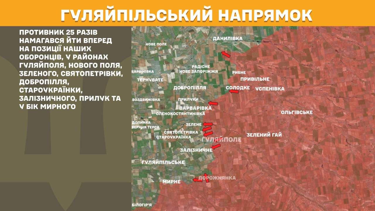 На Гуляйпільському напрямку противник 25 разів намагався йти вперед на позиції наших оборонців, у районах Гуляйполя, Нового Поля, Зеленого, Святопетрівки, Добропілля, Староукраїнки, Залізничного, Прилук та у бік Мирного.