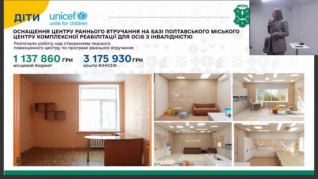 Крім того, майже 3,2 млн грн від ЮНІСЕФ спрямовано на оснащення центру раннього втручання на базі Центру комплексної реабілітації для людей з інвалідністю — фактично розпочато роботу першого повноцінного такого центру в громаді. Ще понад 1,1 млн грн — це кошти міського бюджету.
