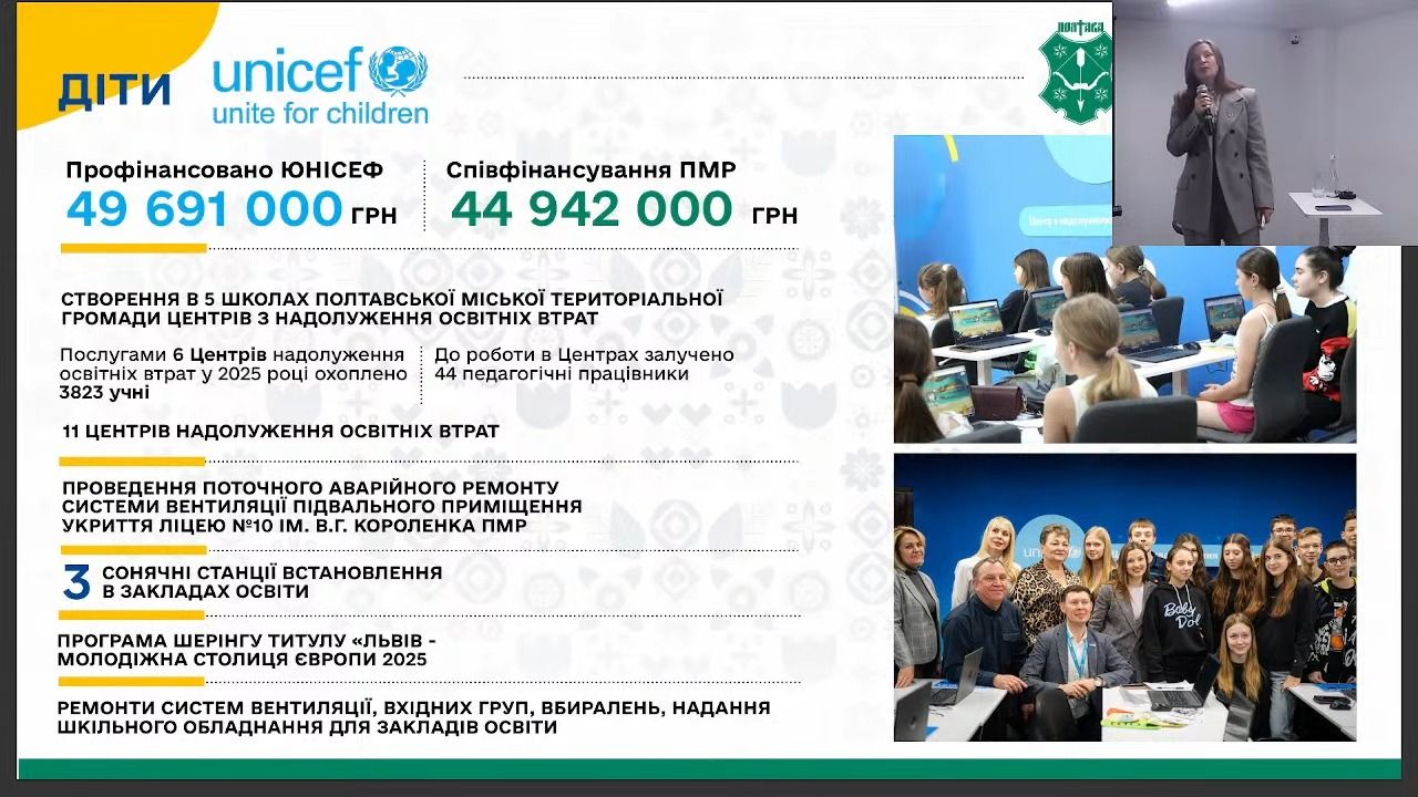 Катерина Ямщикова розповіла, що після всебічної перевірки ЮНІСЕФ співпрацює з Полтавською міськрадою за всіма напрямами. Загалом 49 млн 691 тис. грн надійшли безпосередньо на рахунки Полтавської міської ради для реалізації проєктів за співфінансування з бюджету Полтавської громади. Зокрема, це й створення центрів надолуження освітніх втрат у школах Полтави. У 2025 році такими центрами вже охоплено шість навчальних закладів. До роботи залучено 44 педагогічних працівники, а навчання проходять майже 4 тисячі учнів.