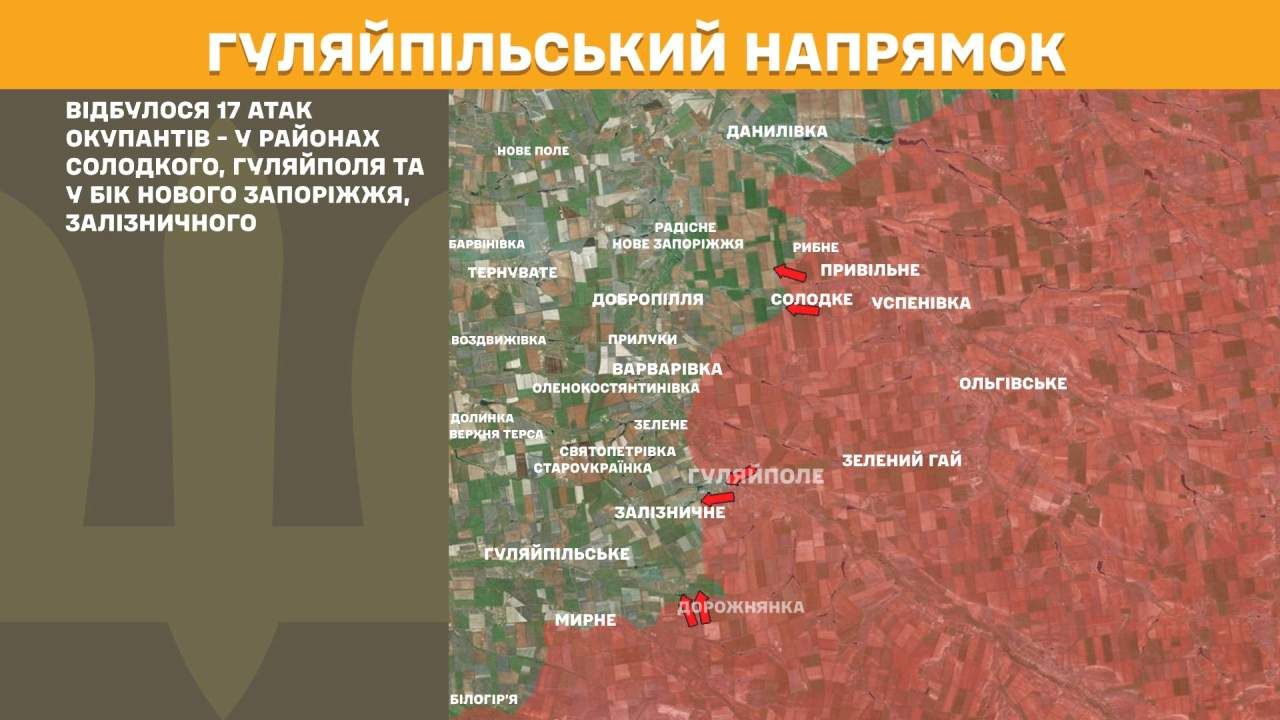На Гуляйпільському напрямку відбулося 17 атак окупантів — у районах Солодкого, Гуляйполя та у бік Нового Запоріжжя, Залізничного.
