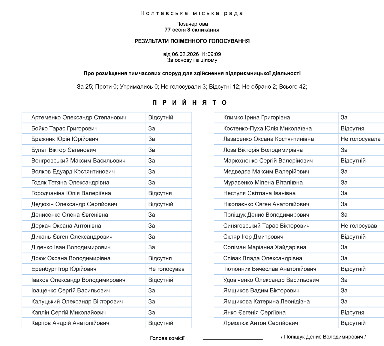 Під час позачергової 77-ї сесії Полтавської міськради депутати без запитань та обговорень проголосували за проєкт рішення «Про розміщення тимчасових споруд для здійснення підприємницької діяльності».