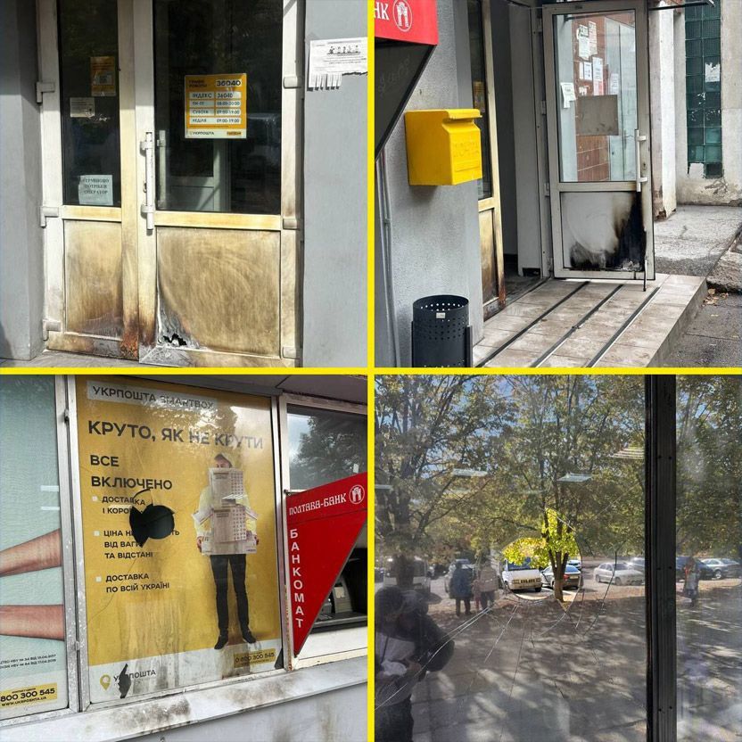 Нагадаємо, перший підпал стався вночі 15 жовтня 2024 року. Невідомі облили горючою сумішшю двері податкової інспекції та підпалили їх. Внаслідок пожежі було пошкоджено вхідну групу, приміщення та банкомат. Наступної ночі, 16 жовтня, близько 4-ї години ранку, загорілися вхідні двері відділення «Укрпошти» на Садах-1. Також було пошкоджене вікно — в нього кинули важкий предмет.