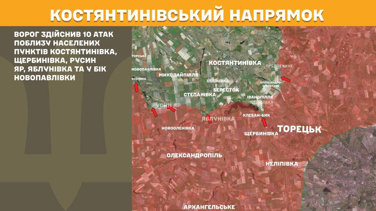 На Костянтинівському напрямку ворог здійснив 10 атак поблизу населених пунктів Костянтинівка, Щербинівка, Русин Яр, Яблунівка та у бік Новопавлівки.