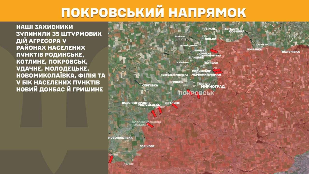 На Покровському напрямку наші захисники зупинили 35 штурмових дій агресора у районах населених пунктів Родинське, Котлине, Покровськ, Удачне, Молодецьке, Новомиколаївка, Філія та у бік населених пунктів Новий Донбас й Гришине.