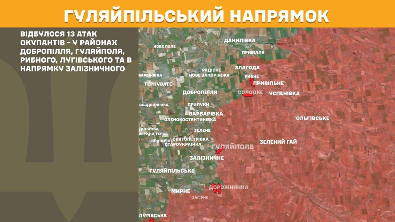 На Гуляйпільському напрямку відбулося 13 атак окупантів — у районах Добропілля, Гуляйполя, Рибного, Лугівського та в напрямку Залізничного.