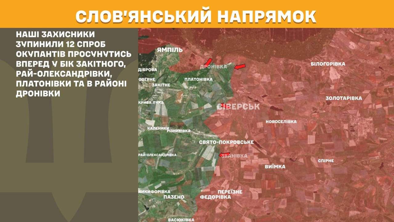 На Слов’янському напрямку протягом учорашньої доби наші захисники зупинили 12 спроб окупантів просунутись вперед у бік Закітного, Рай-Олександрівки, Платонівки та в районі Дронівки.