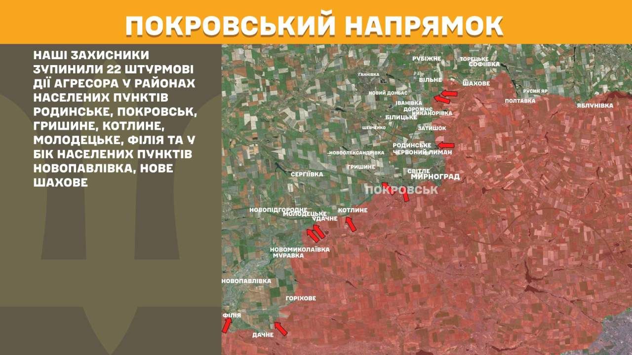 На Покровському напрямку наші захисники зупинили 22 штурмові дії агресора у районах населених пунктів Родинське, Покровськ, Гришине, Котлине, Молодецьке, Філія та у бік населених пунктів Новопавлівка, Нове Шахове.
