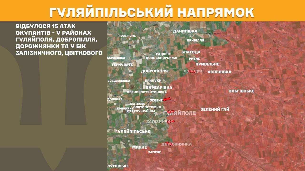 На Гуляйпільському напрямку відбулося 15 атак окупантів — у районах Гуляйполя, Добропілля, Дорожнянки та у бік Залізничного, Цвіткового.