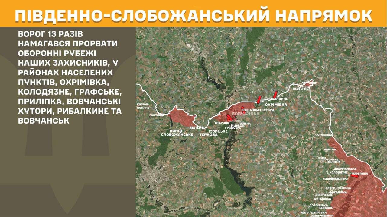 На Південно-Слобожанському напрямку ворог 13 разів намагався прорвати оборонні рубежі наших захисників, у районах населених пунктів, Охрімівка, Колодязне, Графське, Приліпка, Вовчанські Хутори, Рибалкине та Вовчанськ.