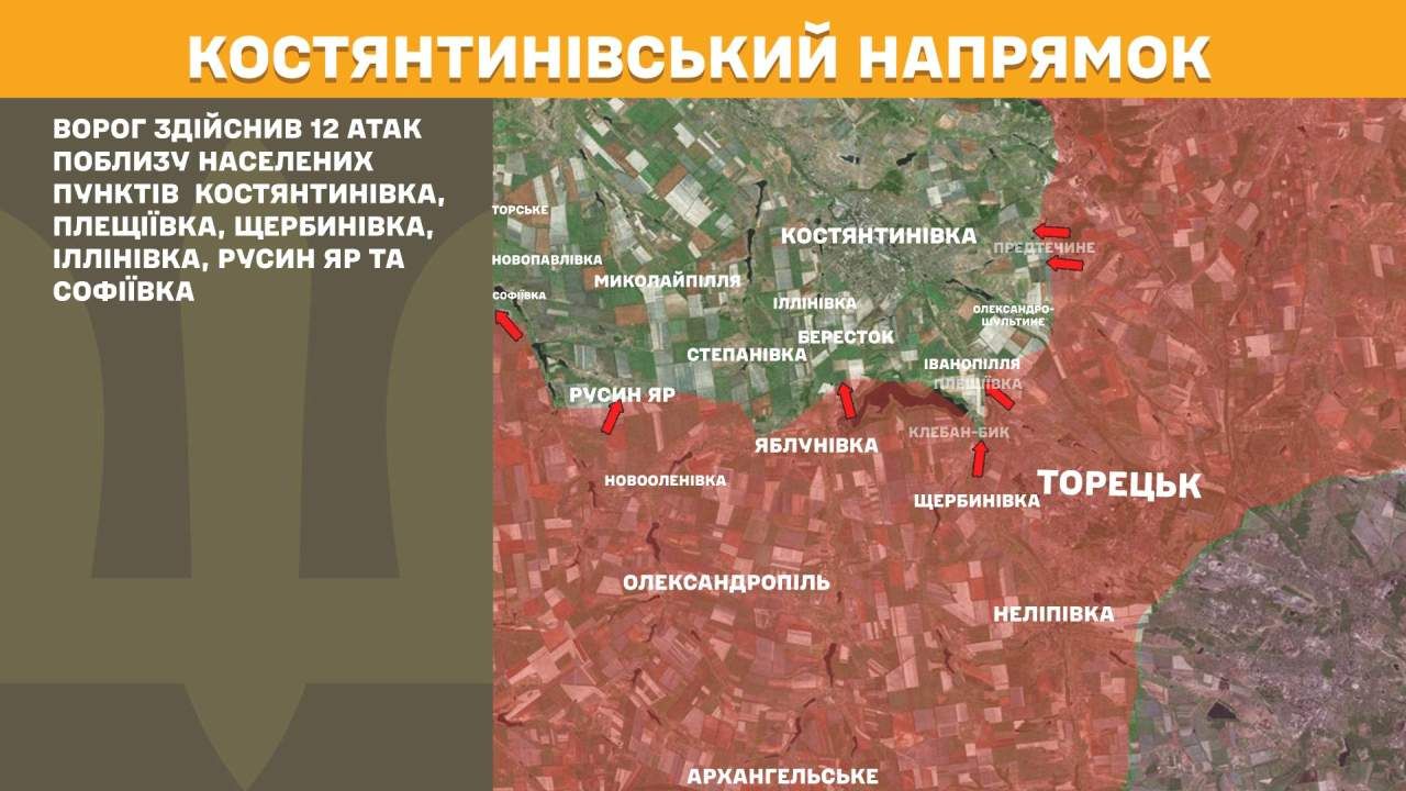 На Костянтинівському напрямку ворог здійснив 12 атак поблизу населених пунктів Костянтинівка, Плещіївка, Щербинівка, Іллінівка, Русин Яр та Софіївка.