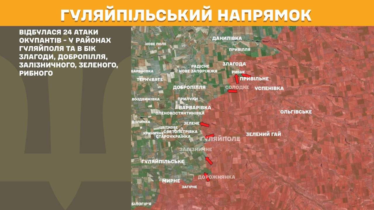 На Гуляйпільському напрямку відбулася 24 атаки окупантів — у районах Гуляйполя та в бік Злагоди, Добропілля, Залізничного, Зеленого, Рибного.