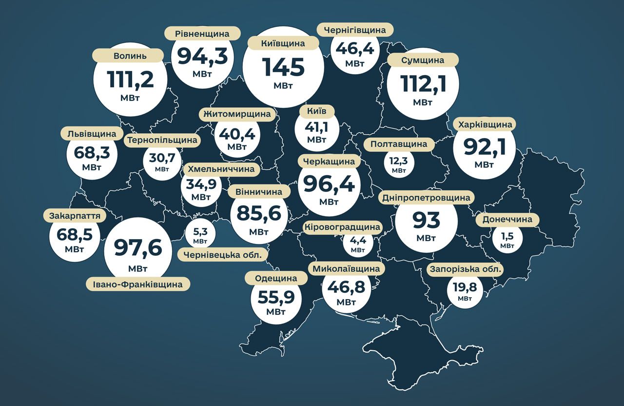 - Київська область — 145 МВт;