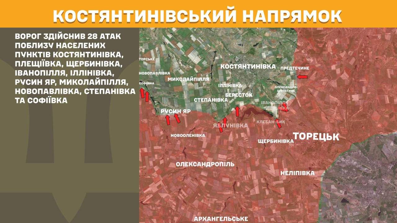 На Костянтинівському напрямку ворог здійснив 28 атак поблизу населених пунктів Костянтинівка, Плещіївка, Щербинівка, Іванопілля, Іллінівка, Русин Яр, Миколайпілля, Новопавлівка, Степанівка та Софіївка.