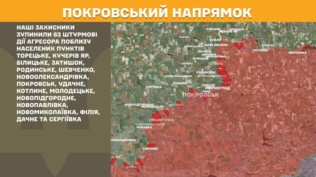 На Покровському напрямку наші захисники зупинили 63 штурмові дії агресора поблизу населених пунктів Торецьке, Кучерів Яр, Білицьке, Затишок, Родинське, Шевченко, Новоолександрівка, Покровськ, Удачне, Котлине, Молодецьке, Новопідгородне, Новопавлівка, Новомиколаївка, Філія, Дачне та Сергіївка.