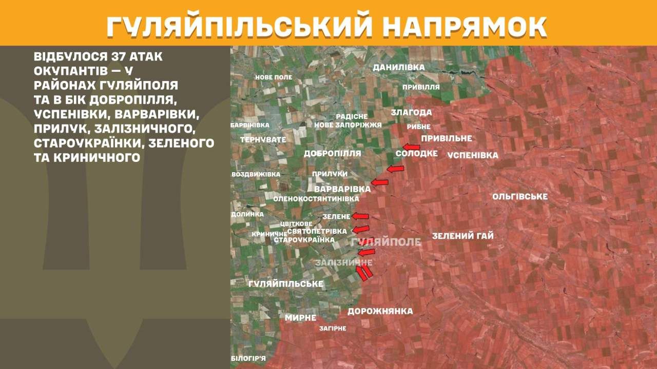 На Гуляйпільському напрямку відбулося 37 атак окупантів — у районах Гуляйполя та в бік Добропілля, Успенівки, Варварівки, Прилук, Залізничного, Староукраїнки, Зеленого та Криничного.