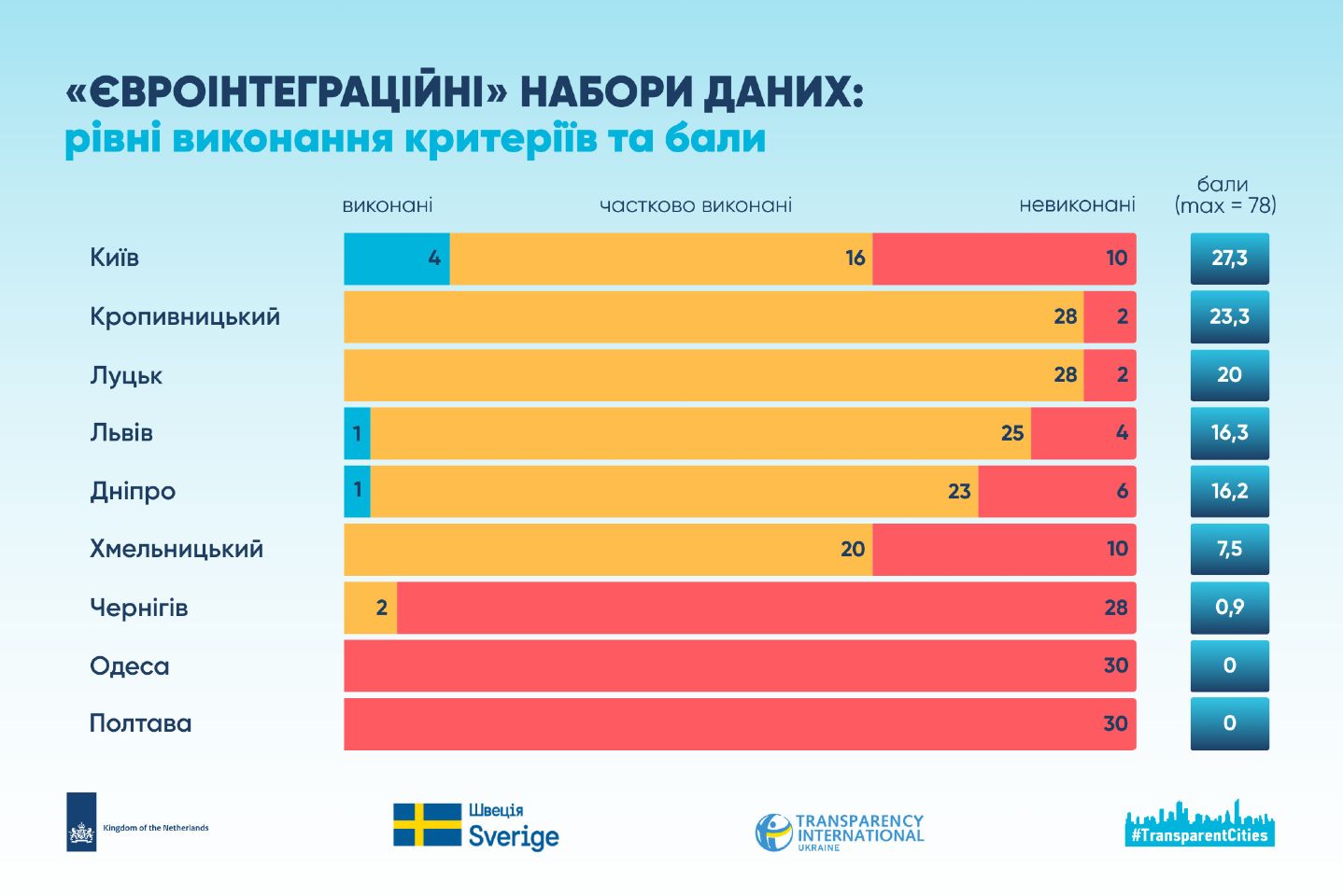 У дослідженні оцінили рівень готовності 11 муніципалітетів до інтеграції з Європейським Союзом за 40 критеріями. До них належать Полтава, Київ, Луцьк, Кропивницький, Львів, Дніпро, Запоріжжя, Хмельницький, Харків, Чернігів та Одеса.