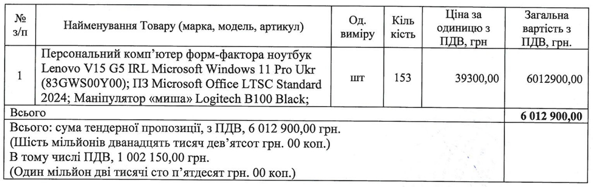 Закупівля 153 ноутбуків була виписана максимально детально. Якщо перекласти технічні вимоги простою мовою, то замовник шукав не просто «сучасний ноутбук для офісної роботи», а конкретну модель одного виробника. Вимоги до міліметра списані з офіційної брошури лептопа Lenovo V15: укорочений SSD-накопичувач формату 2242, наявність порту RJ-45 у тонкому корпусі та акумулятор ємності не менше 47 Вт-год, наявність сертифіката стійкості до ударів MIL STD 810Н. Інші виробники просто не могли запропонувати альтернативу під такий мікс характеристик.