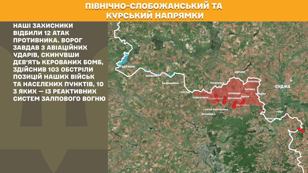 На Північно-Слобожанському і Курському напрямках минулої доби наші захисники відбили 12 атак противника. Ворог завдав 3 авіаційних ударів, скинувши дев’ять керованих бомб, здійснив 103 обстріли позицій наших військ та населених пунктів, 10 з яких — із реактивних систем залпового вогню.