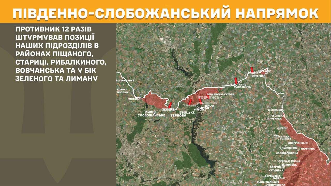 На Південно-Слобожанському напрямку противник 12 разів штурмував позиції наших підрозділів в районах Піщаного, Стариці, Рибалкиного, Вовчанська та у бік Зеленого та Лиману.