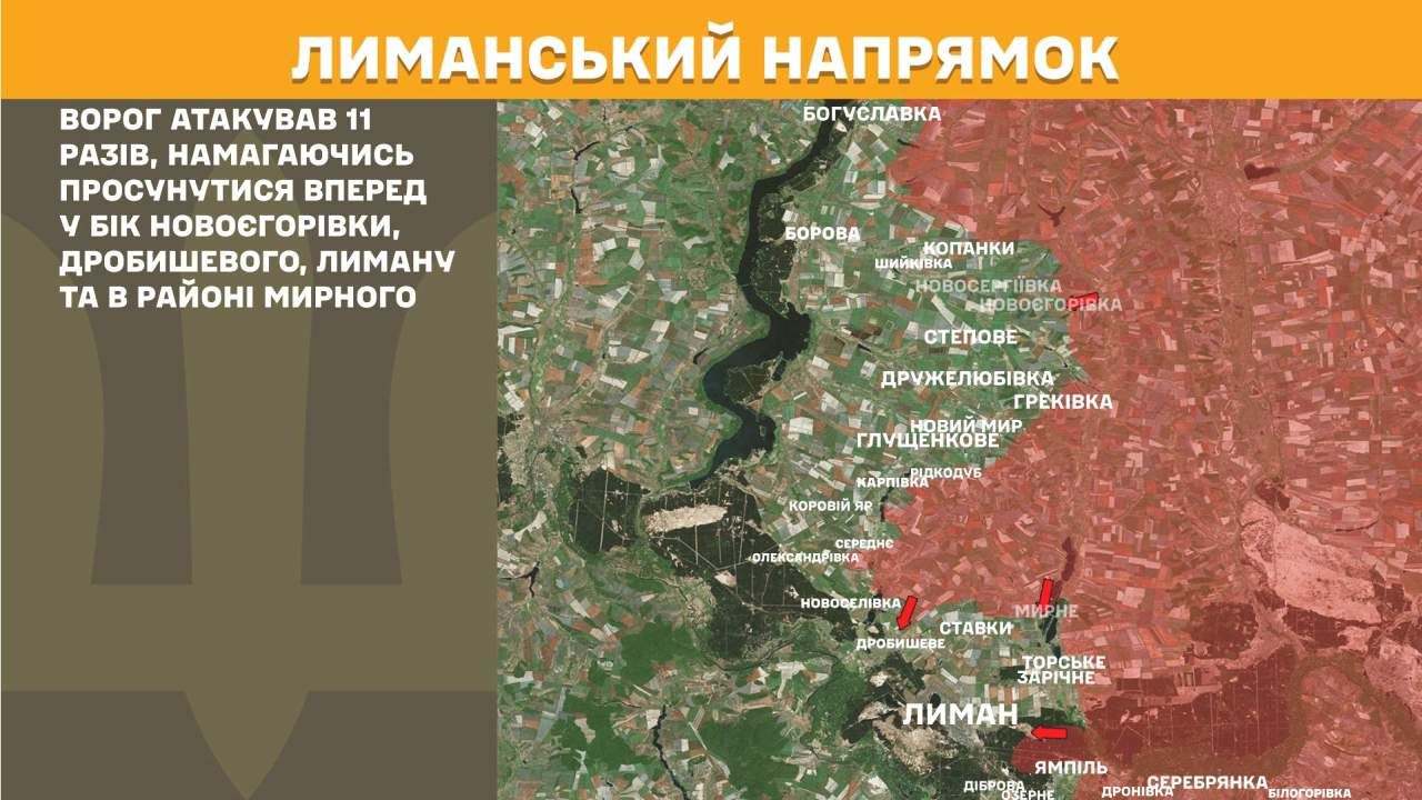 На Лиманському напрямку ворог атакував 11 разів, намагаючись просунутися вперед у бік Новоєгорівки, Дробишевого, Лиману та в районі Мирного.