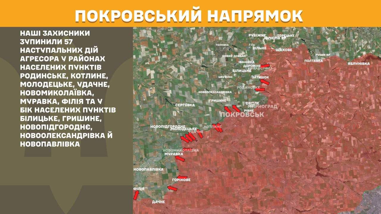 На Покровському напрямку наші захисники зупинили 57 наступальних дій агресора у районах населених пунктів Родинське, Котлине, Молодецьке, Удачне, Новомиколаївка, Муравка, Філія та у бік населених пунктів Білицьке, Гришине, Новопідгороднє, Новоолександрівка й Новопавлівка.