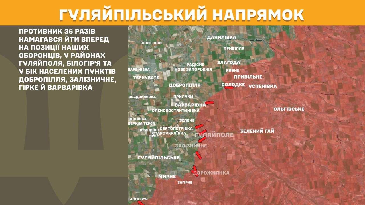 На Гуляйпільському напрямку противник 36 разів намагався йти вперед на позиції наших оборонців, у районах Гуляйполя, Білогір’я та у бік населених пунктів Добропілля, Залізничне, Гірке й Варварівка.