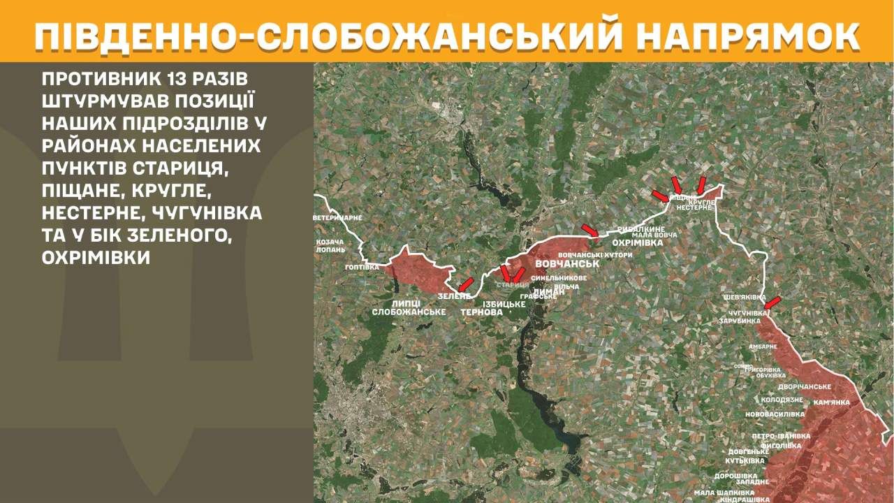 На Південно-Слобожанському напрямку противник 13 разів штурмував позиції наших підрозділів у районах населених пунктів Стариця, Піщане, Кругле, Нестерне, Чугунівка та у бік Зеленого, Охрімівки.