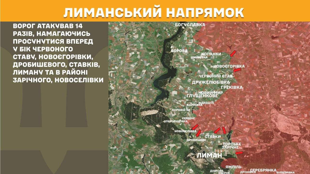 На Лиманському напрямку ворог атакував 14 разів, намагаючись просунутися вперед у бік Червоного Ставу, Новоєгорівки, Дробишевого, Ставків, Лиману та в районі Зарічного, Новоселівки.