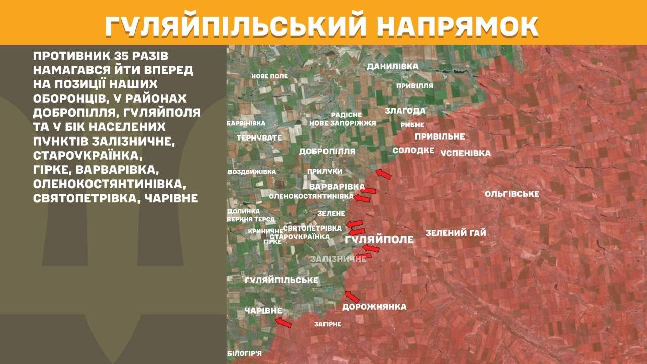 На Гуляйпільському напрямку противник 35 разів намагався йти вперед на позиції наших оборонців, у районах Добропілля, Гуляйполя та у бік населених пунктів Залізничне, Староукраїнка, Гірке, Варварівка, Оленокостянтинівка, Святопетрівка, Чарівне.