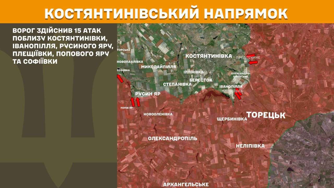 На Костянтинівському напрямку ворог здійснив 15 атак поблизу Костянтинівки, Іванопілля, Русиного Яру, Плещіївки, Попового Яру та Софіївки.