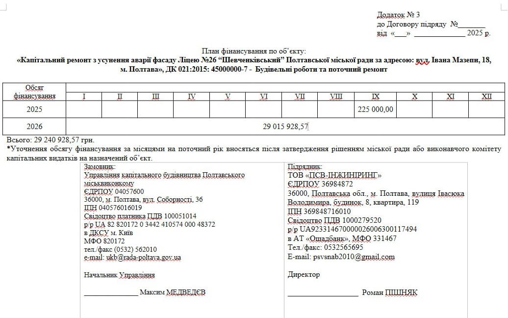 Згідно з календарним планом, основний обсяг робіт та фінансування припадає на 2026 рік. У 2025 році на об’єкті планували освоїти лише 225 тис. грн. Решта суми — понад 29 млн грн — закладена у бюджет на 2026 рік. Кінцевий строк завершення робіт за договором тепер становить січень 2027 року.