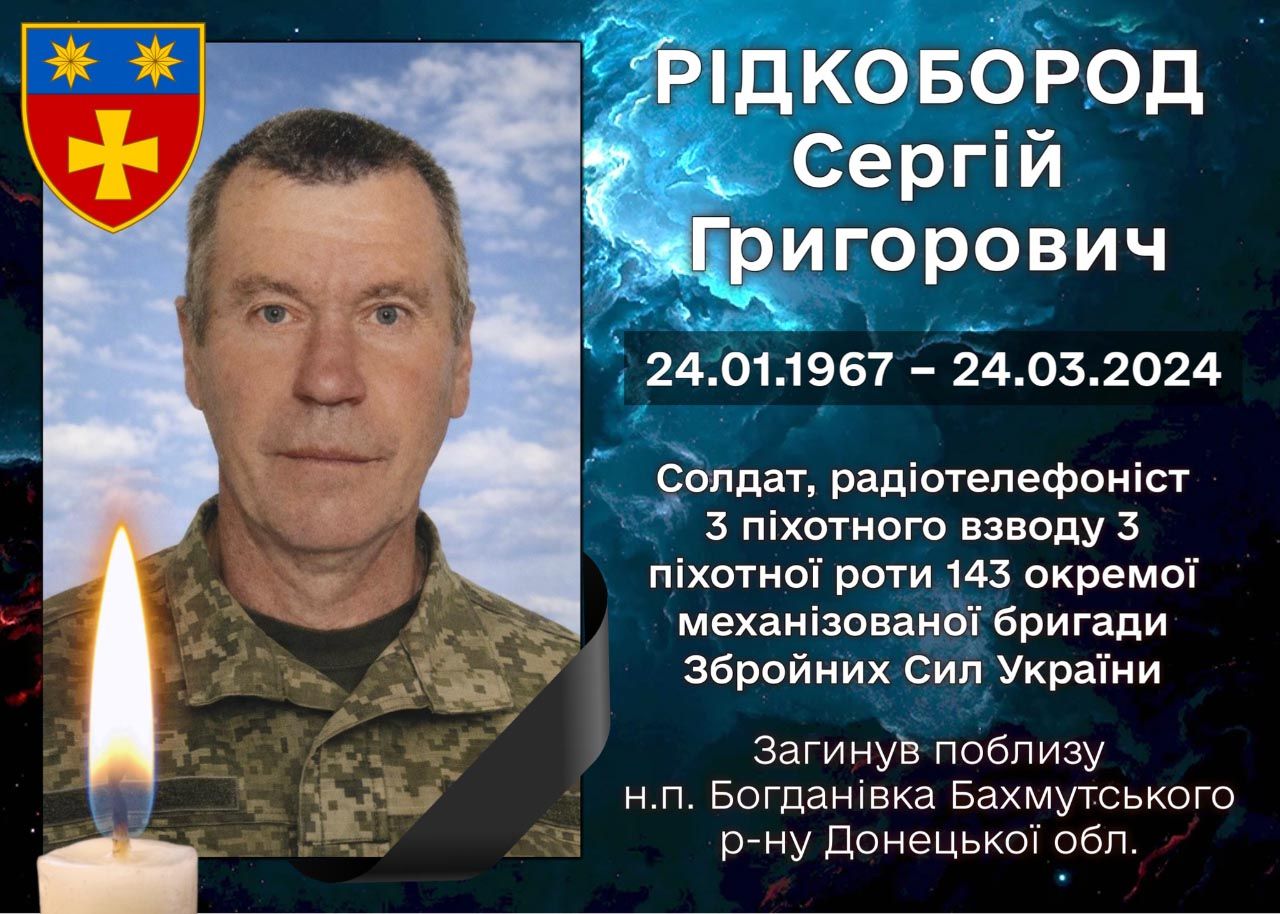 За інформацією Хорольської міської ради, 24 березня 2024 року під час виконання військового обов’язку поблизу села Богданівка Бахмутського району Донецької області загинув Рідкобород Сергій Григорович — солдат, радіотелефоніст піхотної роти 143-ї окремої механізованої бригади.