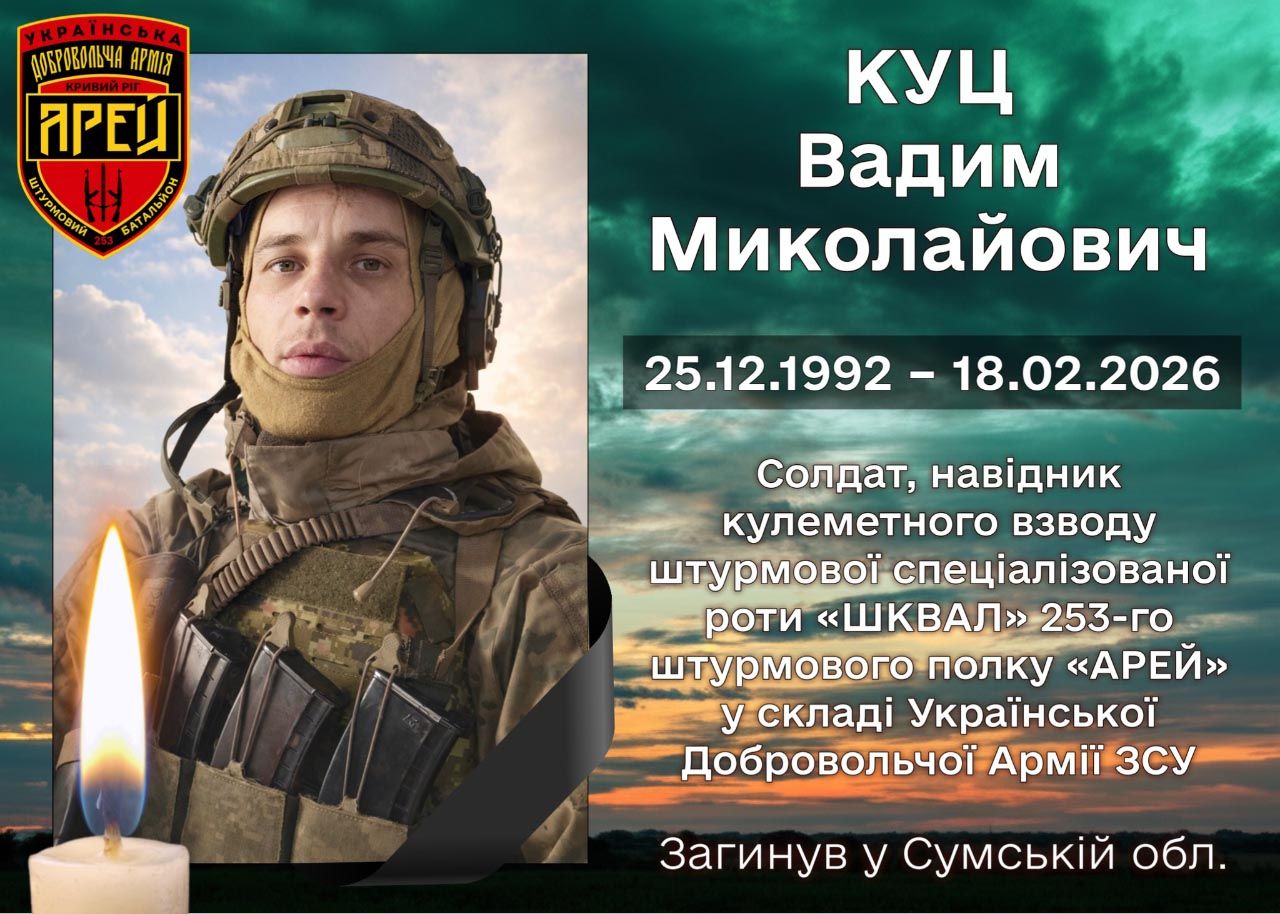За інформацією Хорольської міської ради, 18 лютого 2026 року під час виконання бойового завдання поблизу села Покровка Сумської області внаслідок атаки ворожого FPV-дрона загинув Куц Вадим Миколайович — солдат, навідник кулеметного взводу штурмової спеціалізованої роти «Шквал» 253-го окремого штурмового полку «Арей».