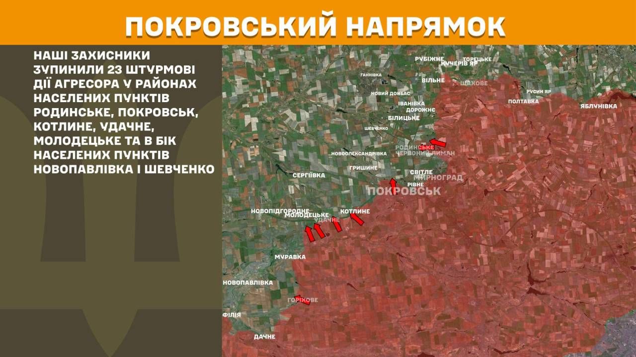 На Покровському напрямку наші захисники зупинили 23 штурмові дії агресора у районах населених пунктів Родинське, Покровськ, Котлине, Удачне, Молодецьке та в бік населених пунктів Новопавлівка і Шевченко.