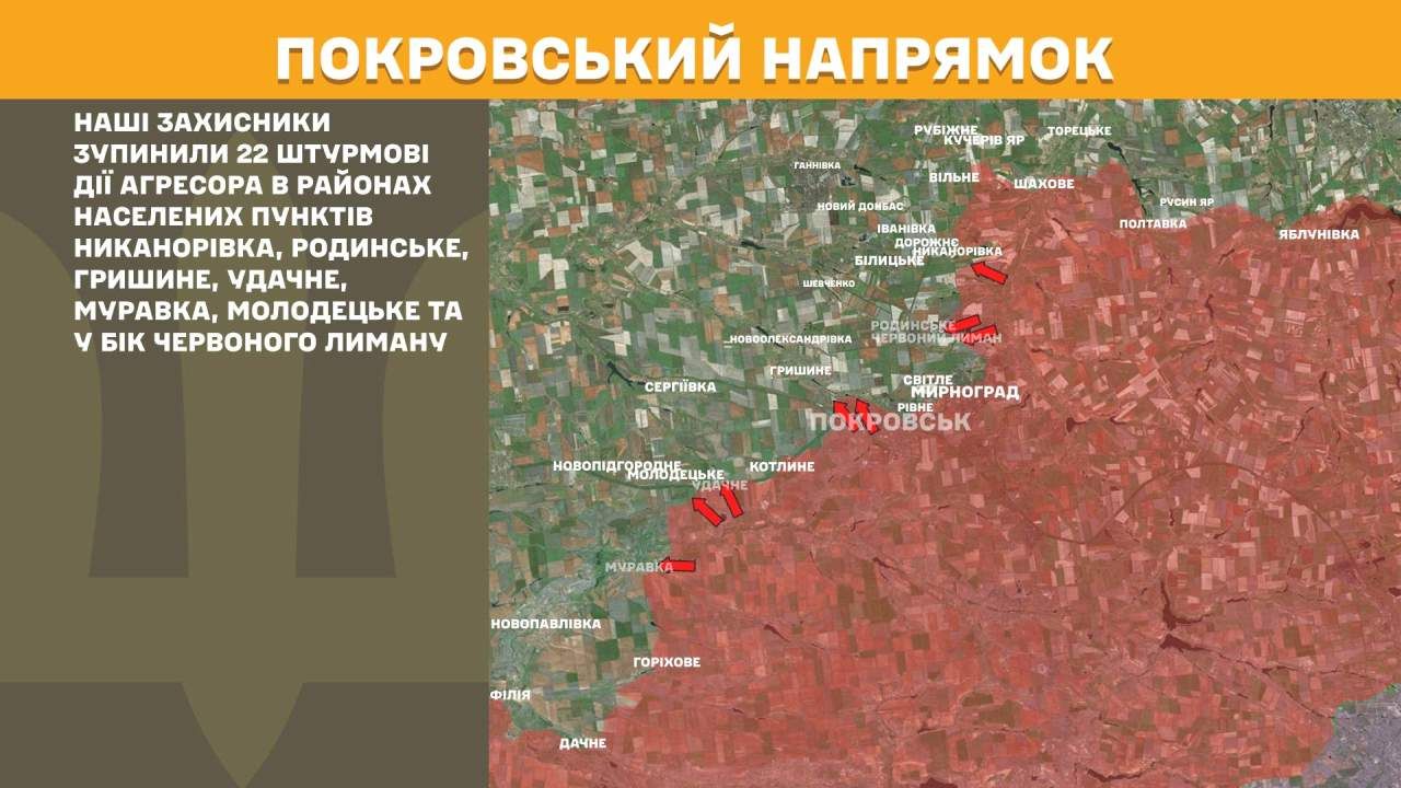 На Покровському напрямку наші захисники зупинили 22 штурмові дії агресора в районах населених пунктів Никанорівка, Родинське, Гришине, Удачне, Муравка, Молодецьке та у бік Червоного Лиману.