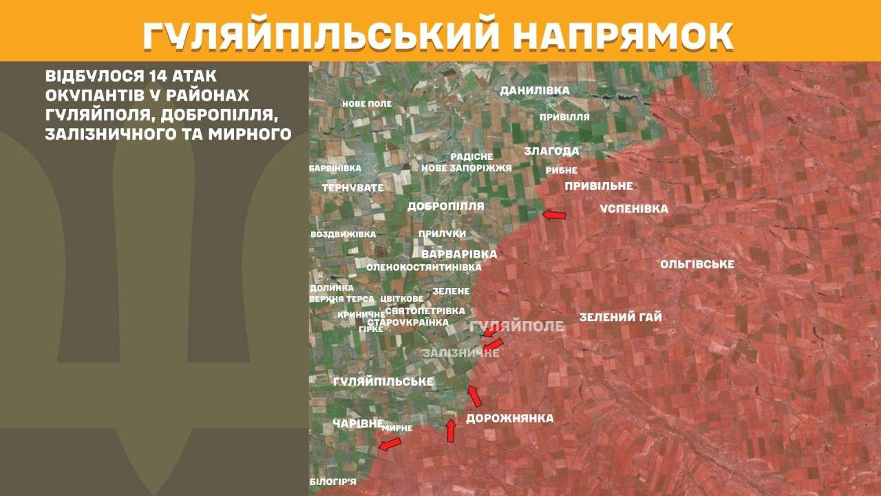 На Гуляйпільському напрямку відбулося 14 атак окупантів у районах Гуляйполя, Добропілля, Залізничного та Мирного.