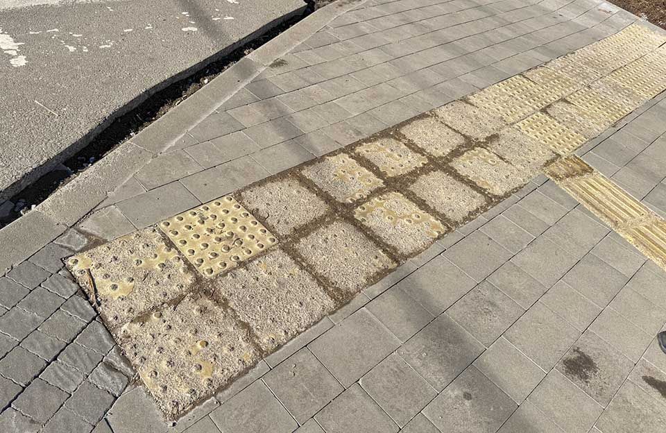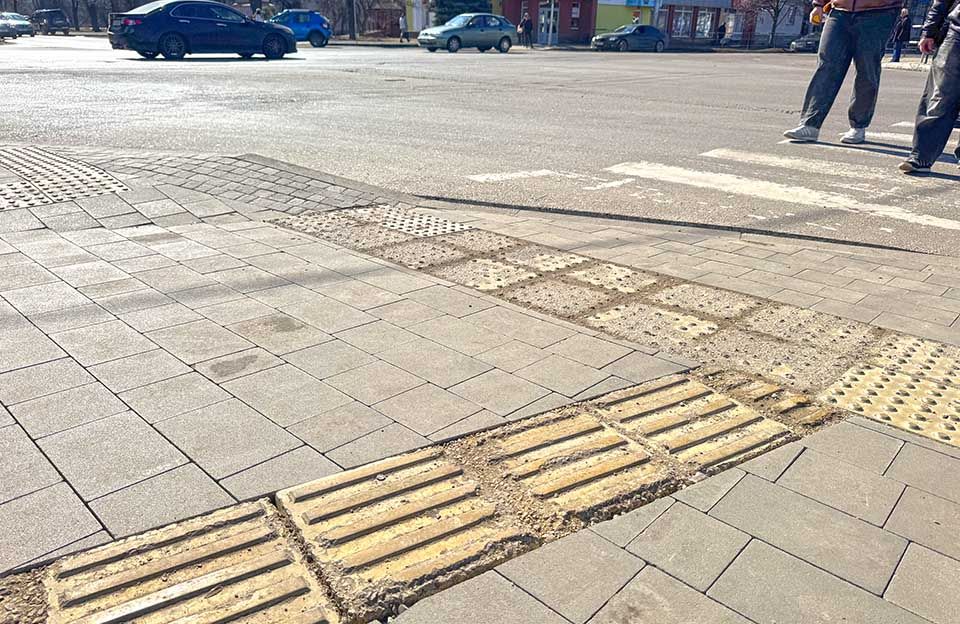 Частину робіт на перехресті виконали ще на початку грудня — тоді з трьох сторін перехрестя на невеликих ділянках тротуару уклали звичайну та тактильну плитку. Саме на цих ділянках після зими й з’явилися перші ознаки руйнування тактильних елементів.