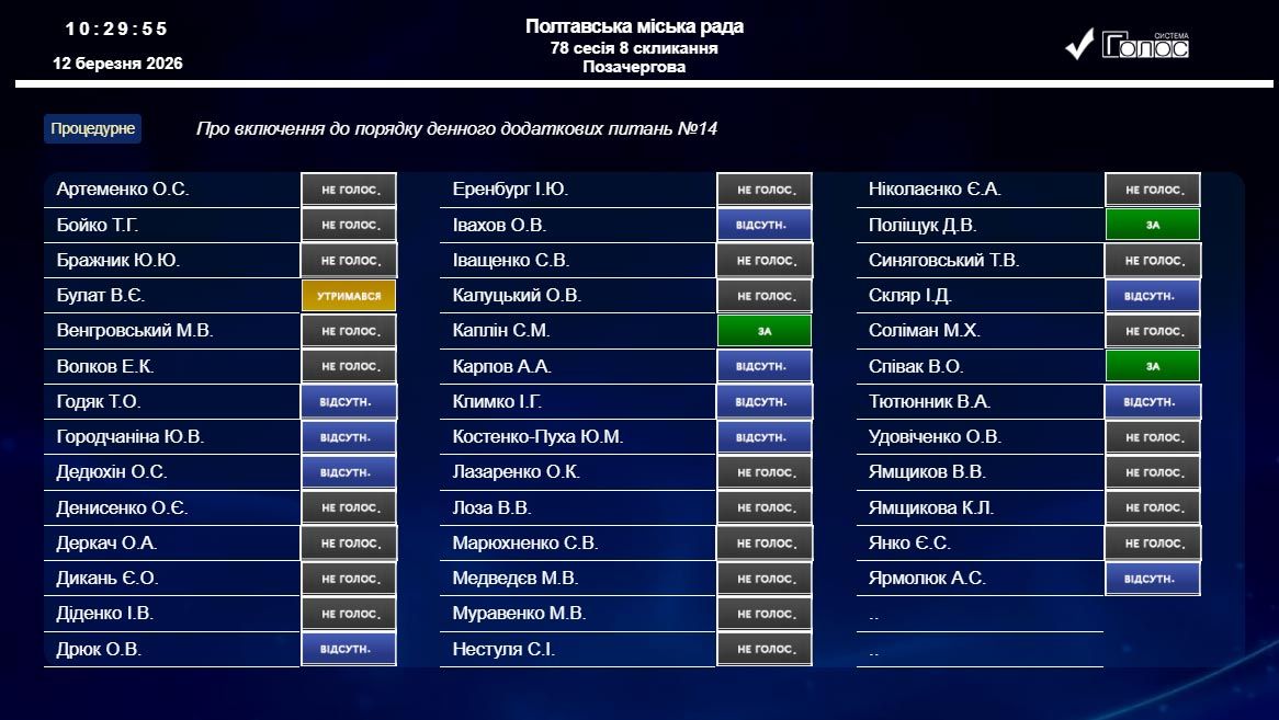 10:25 — З порядку денного за пропозицією УЖКГ виключили питання № 4 «Про внесення змін до Програми розвитку житлово-комунального господарства та благоустрою Полтавської міської територіальної громади на 2025-2027 роки».