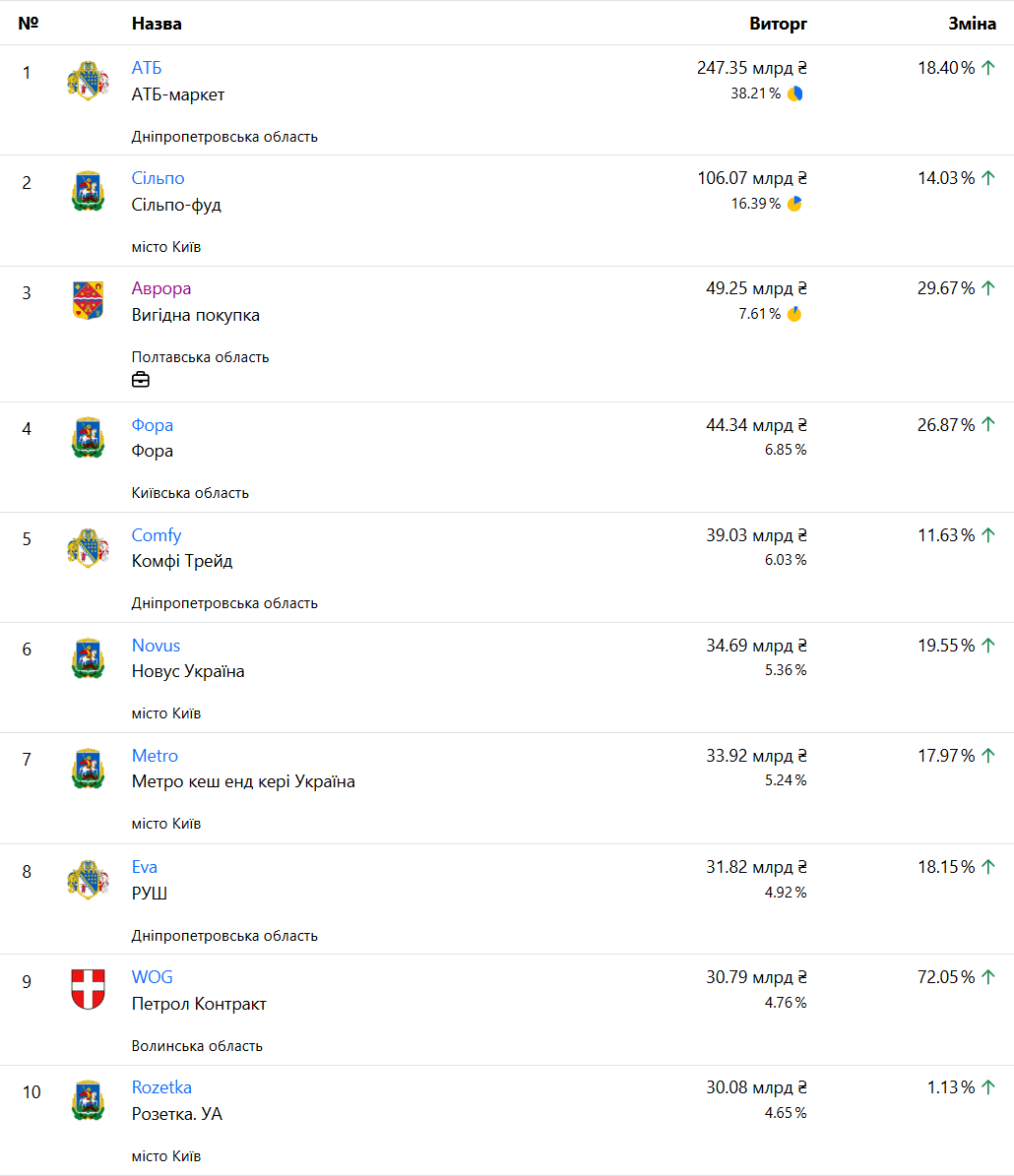 - Компанія Metro (7-ме місце) отримала збиток у розмірі 380,9 млн грн, попри зростання доходу на 18% (до 33,92 млрд грн).