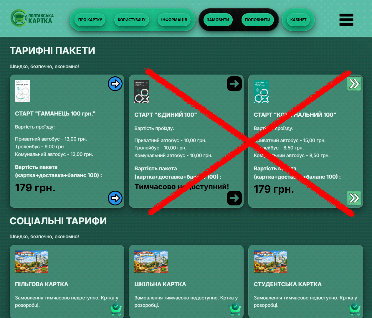 Відповідно до рішення виконавчого комітету Полтавської міської ради від 30 грудня 2021 року № 308, у місті офіційно зареєстровано три види карток: Соціальна картка полтавця, Картка полтавця та Транспортна картка. Картки «Проїзний єдиний» серед них немає.