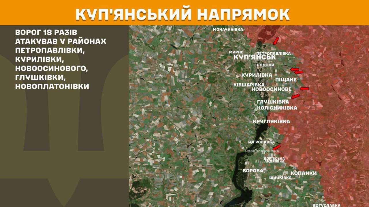 На Куп’янському напрямку ворог 18 разів атакував у районах Петропавлівки, Курилівки, Новоосинового, Глушківки, Новоплатонівки.