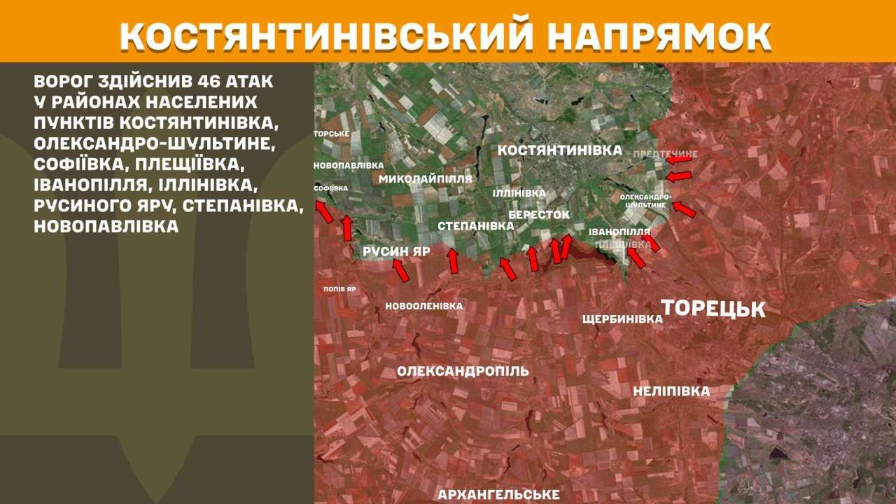 На Костянтинівському напрямку ворог здійснив 46 атак у районах населених пунктів Костянтинівка, Олександро-Шультине, Софіївка, Плещіївка, Іванопілля, Іллінівка, Русиного Яру, Степанівка, Новопавлівка.