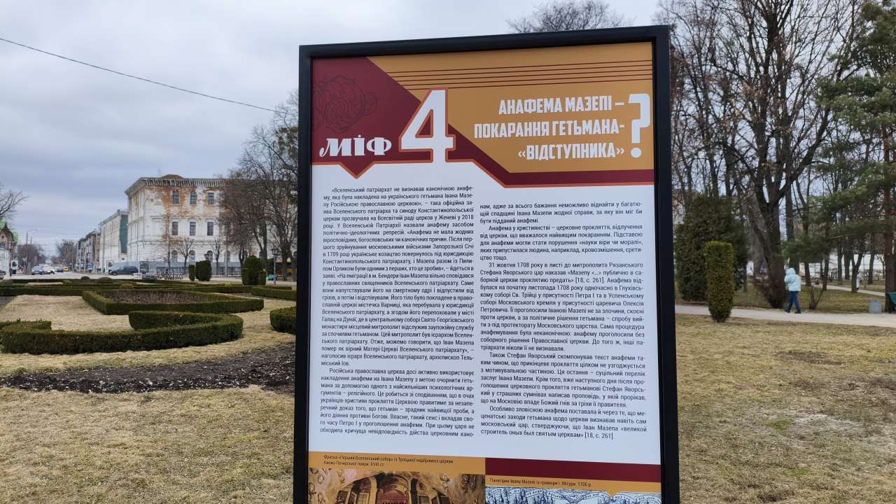Виставка складається з інформаційних стел висотою близько двох метрів, які встановили у Корпусному парку поруч із Монументом Слави. На стендах розміщено спростування ключових міфів ворожої пропаганди щодо постаті Івана Мазепи та подій Полтавської битви.