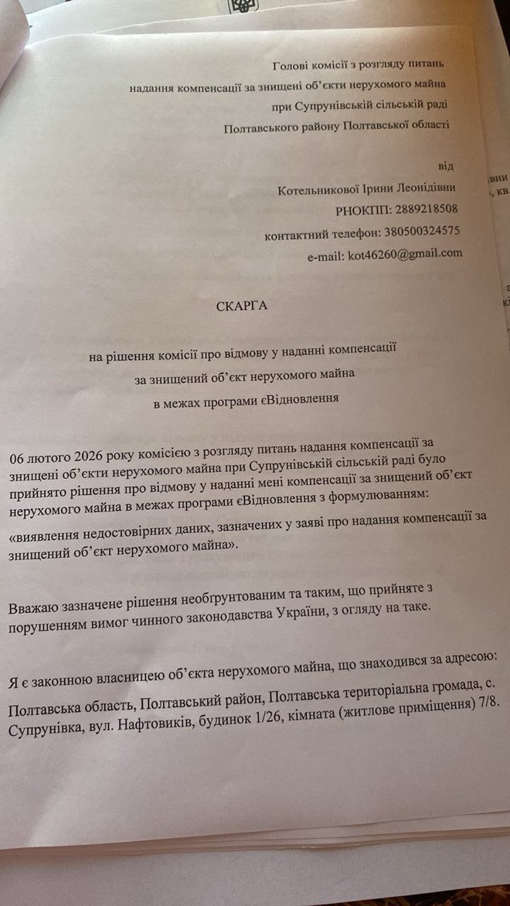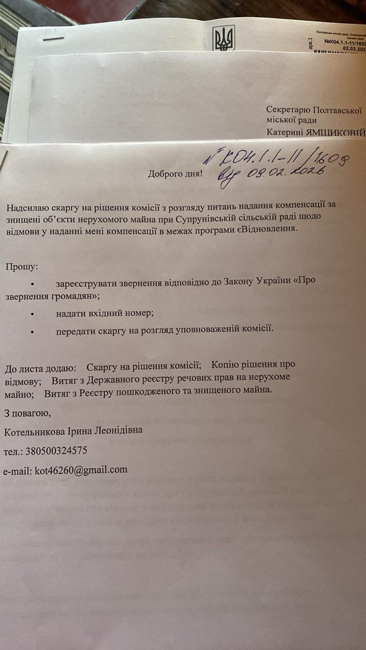 Згідно з новими документами, які Ірина надала редакції, комісія з розгляду питань компенсації при Супрунівській сільраді при Полтавській ТГ продовжує відмовляти їй у наданні житлового сертифіката.