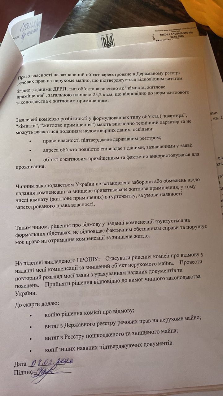 В останній відмові, датованій лютим 2026 року, комісія зачепилася за термінологію: мовляв, у заяві вказано «квартира», тоді як у реєстрах майно значиться як «кімната (житлове приміщення) у гуртожитку». При цьому той факт, що приміщення фізично зруйноване і непридатне для життя, відходить на другий план.