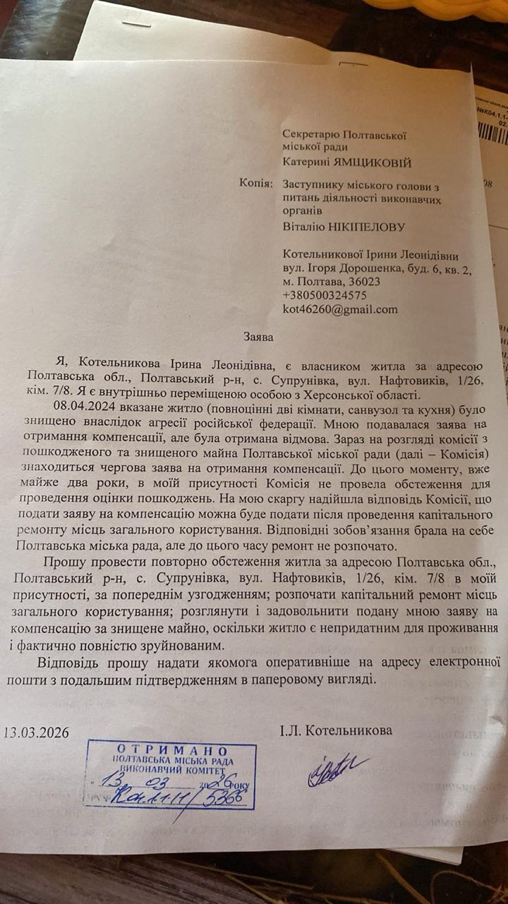 До редакції «Полтавщини» знову звернулася Ірина Котельникова, чиє житло знищила російська ракета 8 квітня 2024 року. Вже за два тижні виповниться рівно два роки з моменту трагедії, проте ситуація для постраждалих так і не зрушила з мертвої точки.