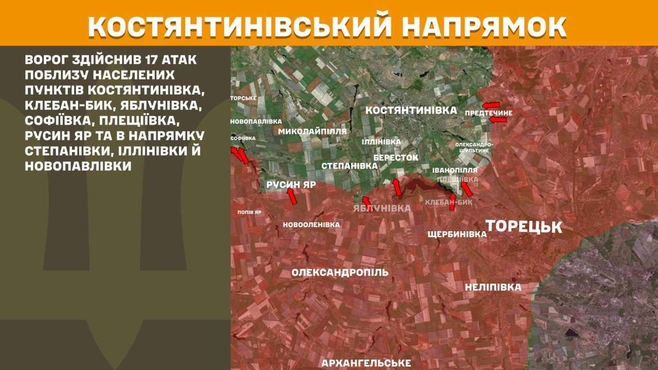 На Костянтинівському напрямку ворог здійснив 17 атак поблизу населених пунктів Костянтинівка, Клебан-Бик, Яблунівка, Софіївка, Плещіївка, Русин Яр та в напрямку Степанівки, Іллінівки й Новопавлівки.